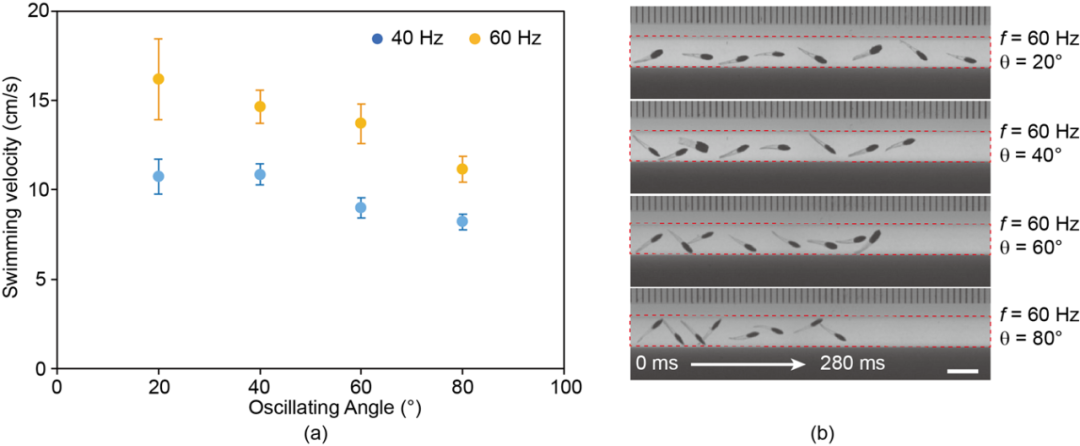 虽然足够小巧,但游泳能力不弱。研究人员通过施加不同振荡角和不同频率的磁场来控制它的运动。实验发现,例如当频率为60 Hz,振荡角为40°时,磁驱软体鱼可以达到30 cm/s的游泳速度。