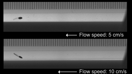 为了模拟评估这个“小个子运动员”在“血管”中的游动能力。研究人员们在直径4.1 mm的玻璃管中对其进行了游泳能力测试: